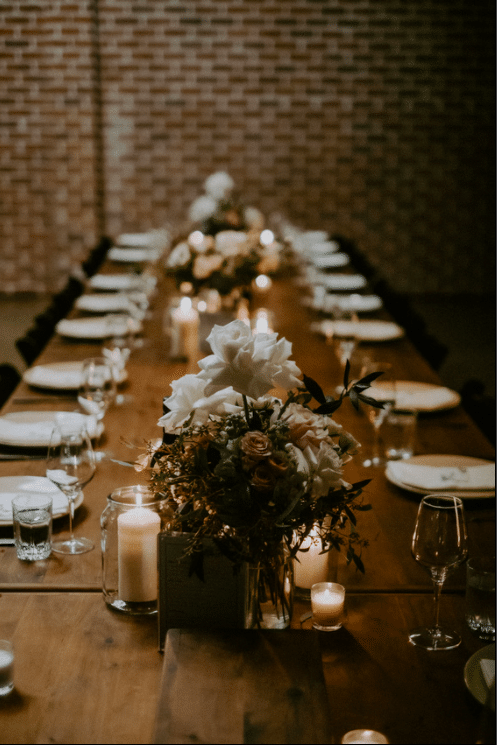 Incorporate greenery and flowers to breathe life into your rustic industrial space. Consider hanging installations, table centerpieces, and bouquets that reflect the organic, unrefined aesthetic. Be sure to mention your venue to your florist so they can work with the overall vision. The infusion of nature’s touch not only adds freshness and vibrancy, but also has a softening effect on the raw industrial elements.