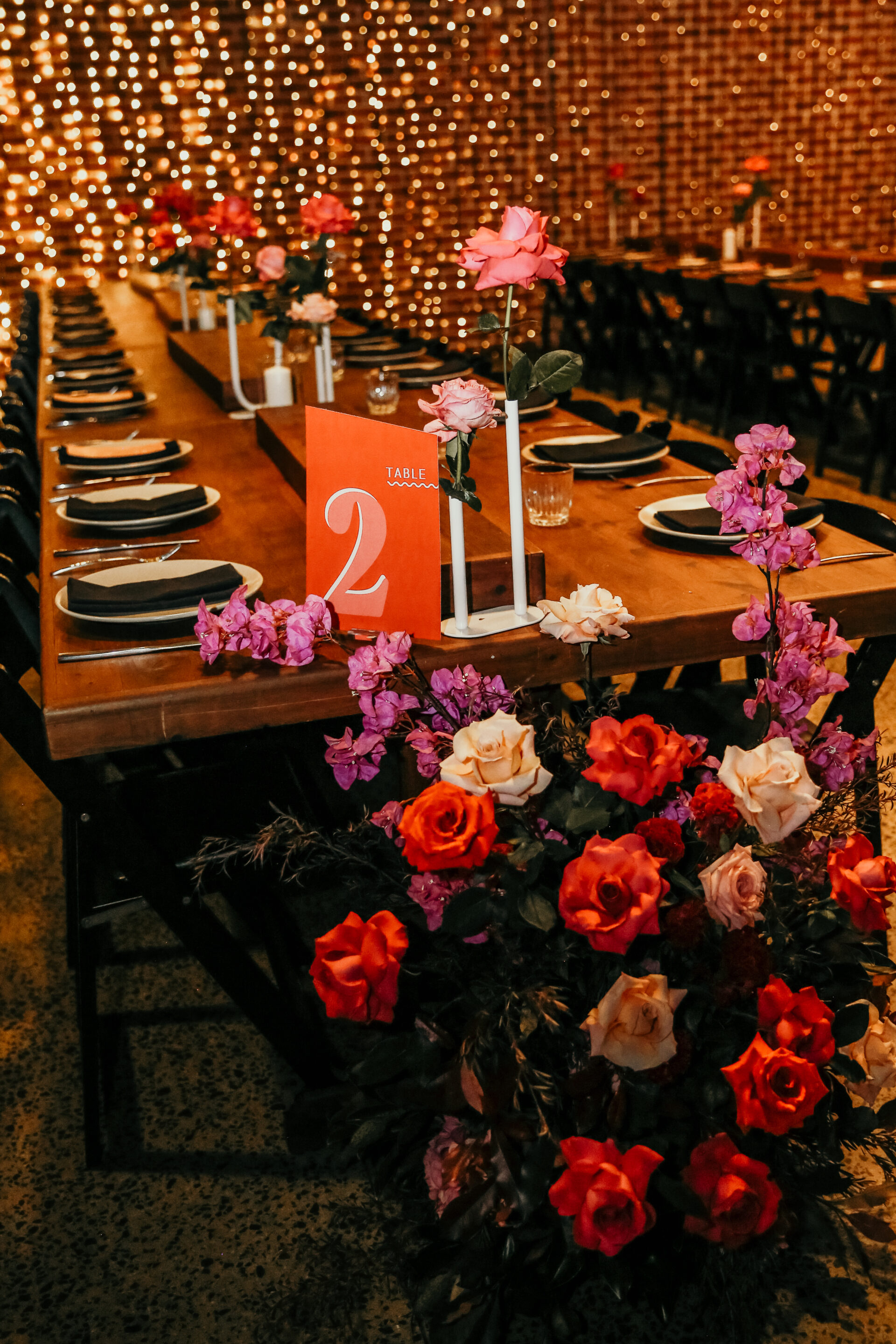 - Florals: Deep red roses, anemones, and ranunculus for bouquets and centrepieces.