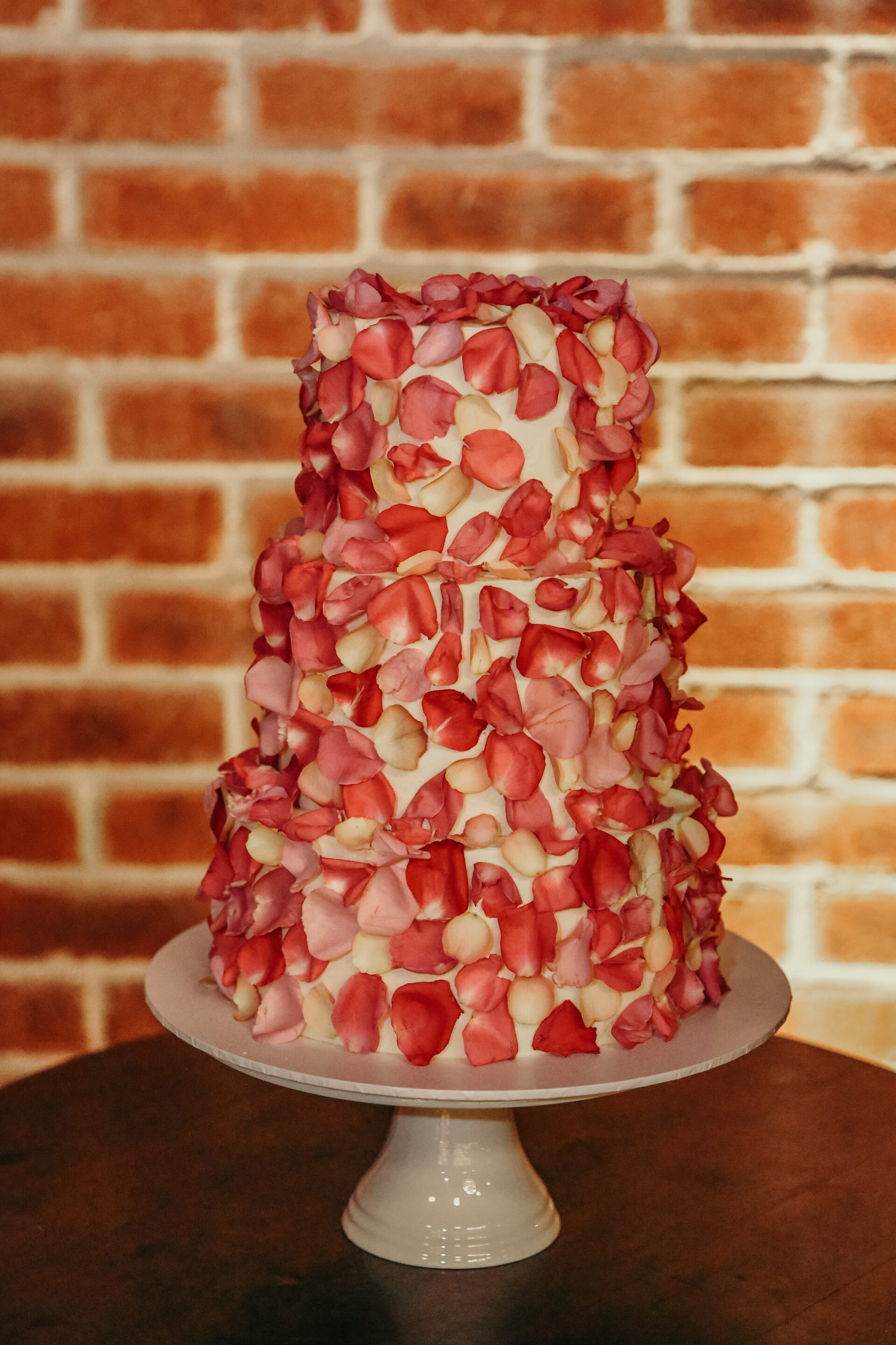 - Three-tier engagement party cake adorned with rose petals at Factory 51 in Brisbane.